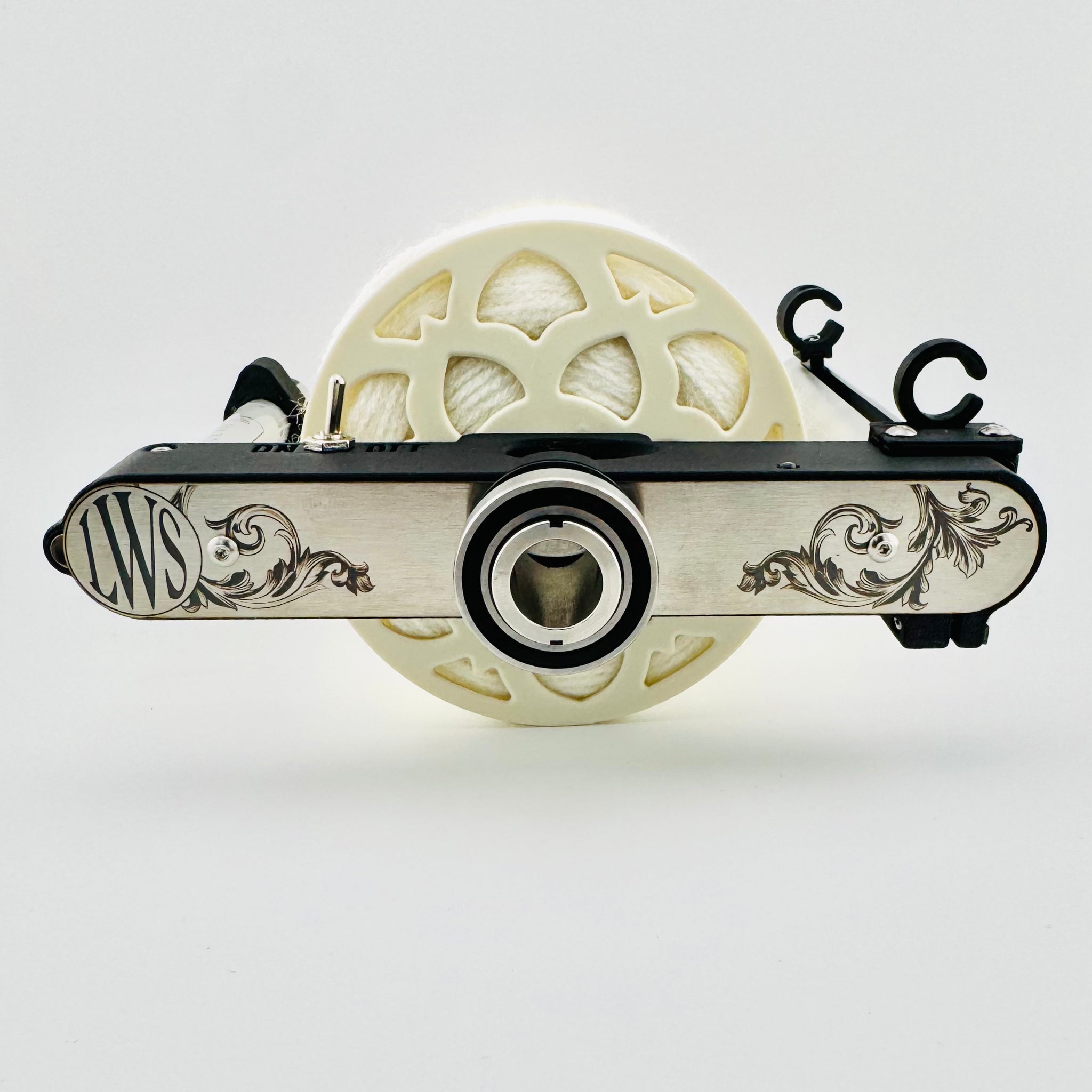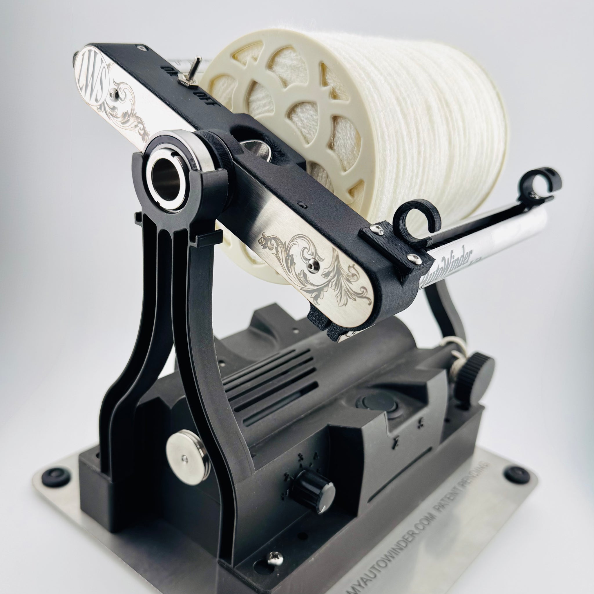 This system is revolutionary for the industry and the first offering of it's kind. The self powered level wind flyer is totally self contained and makes treadling a breeze, as there is no extra drag introduced into the mechanics of the wheel. Turn it on and it does the rest, you can spin for hours without stopping. And finish with a beautiful level wound bobbin when you're complete. The way our systems wind will prevent your fiber from tangling when you're plying or winding off.